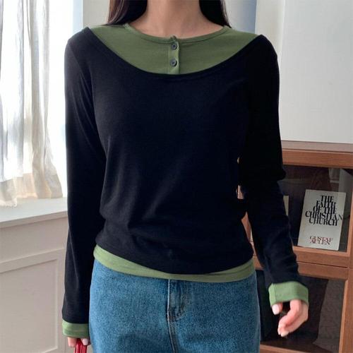 [다잇템]여성 U넥 단추 롱슬리브 코디 티셔츠