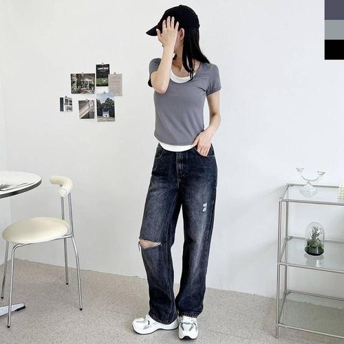 ToB ACC SS1014W 여자 배색 레이어드 스쿱넥 반팔 티셔츠 WFM0WOX