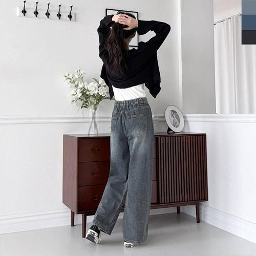 [sado]여성 청바지 뒷밴딩 포켓라인 워싱 와이드 데님팬츠 WSF2007
