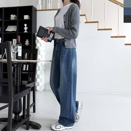 [sado]여성 청바지 뒷밴딩 커브드 벌룬 워싱 와이드 데님팬츠 WSF2008