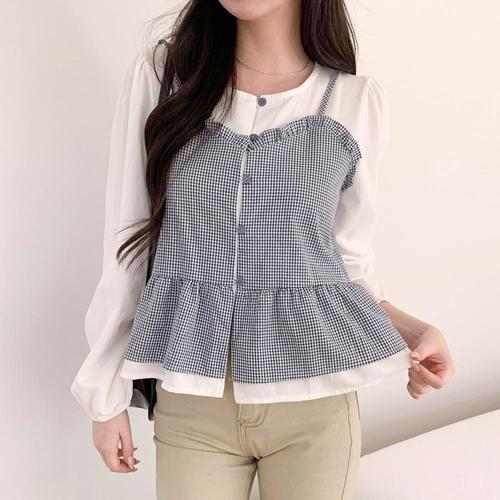 [옷자락]여성 폴리 체크 페플럼 뷔스티에 레이어드 블라우스