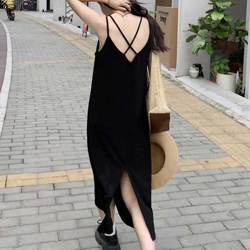 [모노무드]모노무드 민소매 뒷 브이넥파임 엑스자 블랙 나시원피스 뒷트임