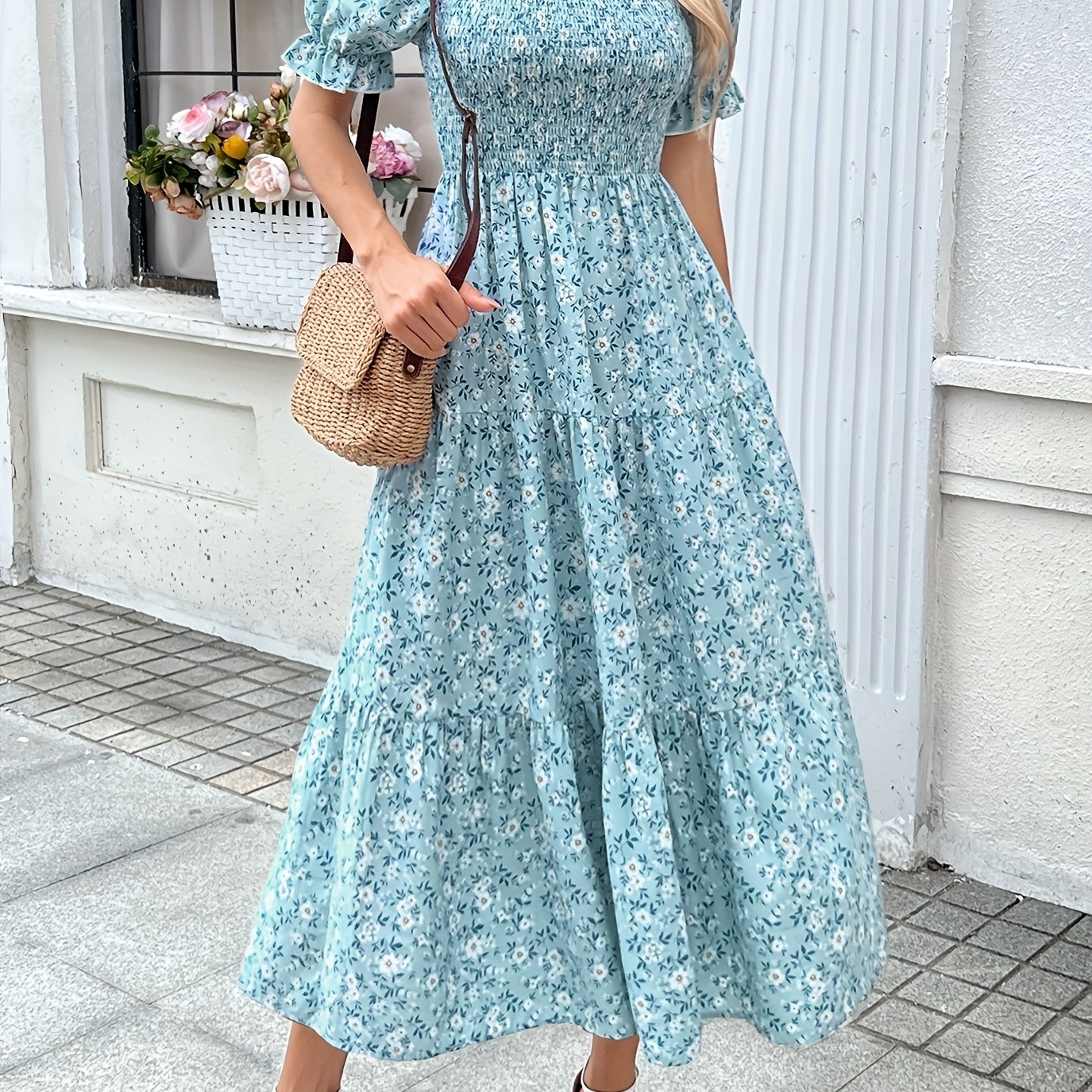 TEMU 뉴 디자인 센스 작은 군중 꽃무늬 백리스 프린트 소매 주름 빅 스커트 여성용 반팔 드레스