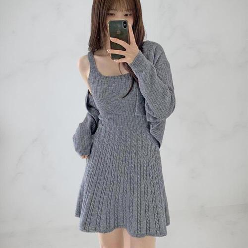 [옷자락]여성 케이블 니트 민소매 플레어 드레스 가디건 세트