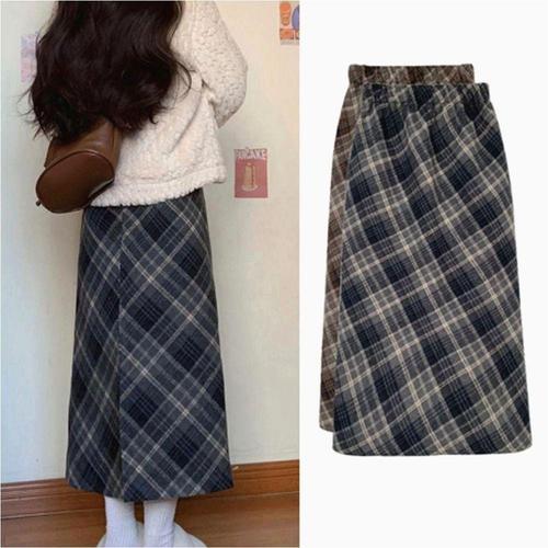 ANYOU 체크 스커트 가을 겨울 롱 스커트 플리츠 스커트 베이직 A라인 스커트