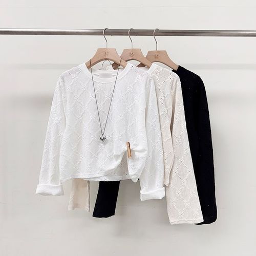 미즈큐즈 / 가을 펀칭 레이스 세미 크롭 루즈핏 긴팔 티셔츠
