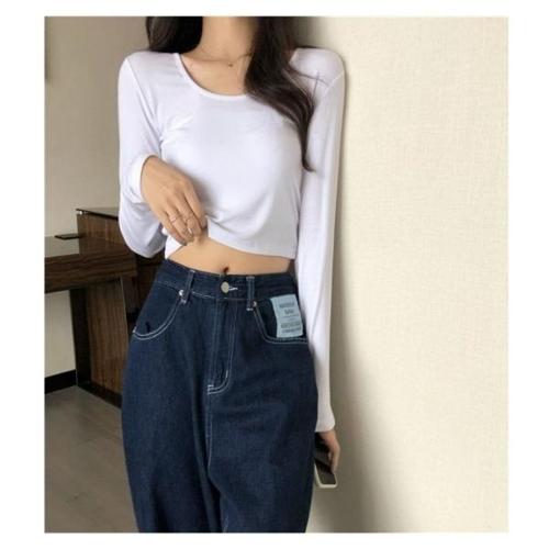 마켓피아 여성용 봄 슬림 크롭 긴팔 티셔츠