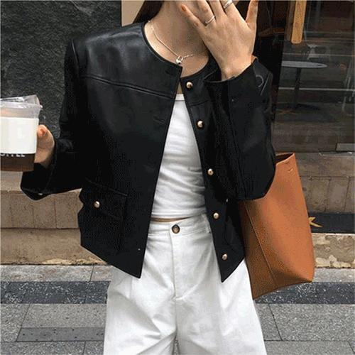 [르뚜앙]방골라 봄 가을 라운드넥 페이크 레더 크롭 자켓 블랙 가죽자켓 아우터 하객룩 오피스룩 데일리..