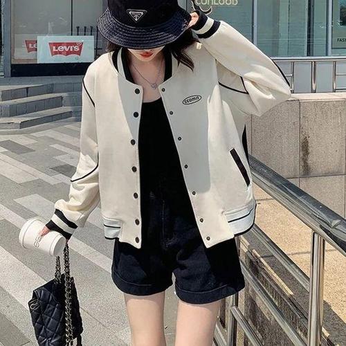 HXAO 여성 봄버 재킷 코트 화이트 가을 겨울 버튼 야구 항공 점퍼 여성용 긴 소매 크롭 아우터웨어