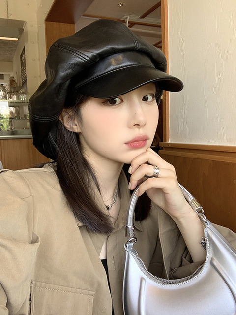 7197273 남자 헌팅캡 뉴스보이캡 팔각모 베레모 작은가게 중장년 따뜻한 모자 남 추동 PU 가죽 복고풍 포워