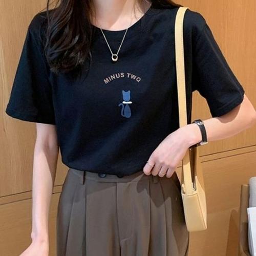 [엄지척]여성 고양이 검정반팔티 봄 여름 프린팅 20대_19610682_667501