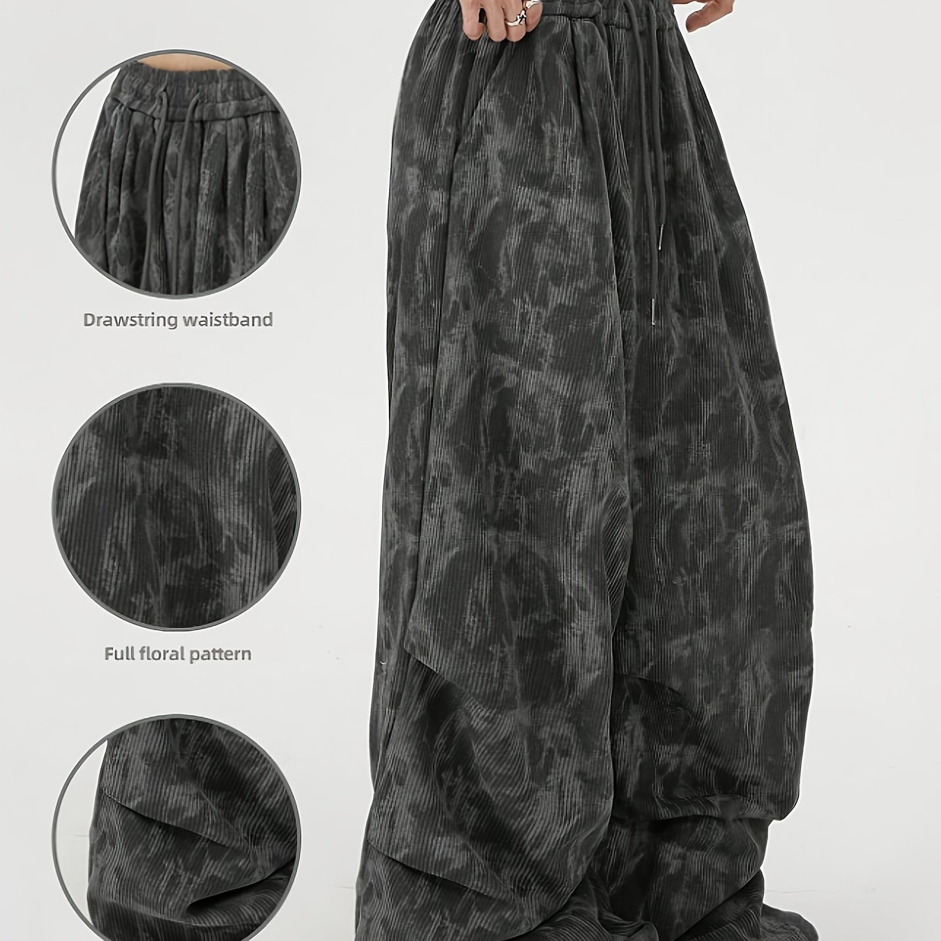 TEMU 여성용 스타일리시 블랙 플로랄 프린트 와이드 레그 팬츠 - 하이웨이스트, 끈 조절 허리띠, 전체 꽃무늬, 가을/겨울에 완벽, 캐주얼부터 포멀웨어까지, 캐주얼 웨어 팬츠 | 플로럴 프린트 팬츠 | 끈 조절 허리띠 팬츠, 레이디 와이드 레그 트라우저, 여성용 와이드 레그 트라우저, 여성용 바지/바지