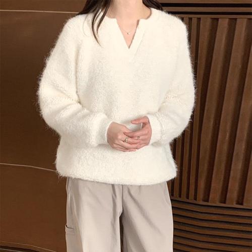 [문에이블]문에이블 여자 여성 겨울 루즈핏 브이넥 부클 도톰 따뜻한 울 슬릿 브이넥 헤어리 긴팔 니트