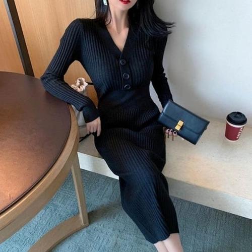 [엄지척]여성 단추 슬림핏 니트 롱 원피스 긴팔 골지롱원피스_19913304_667501