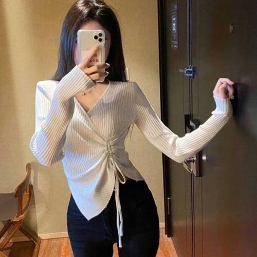 [엄지척]여자 20대 데일리 룩 슬림 골지 셔링 브이넥 니트 티_19680981_667501