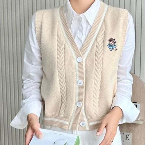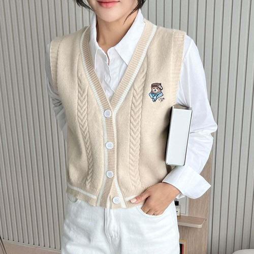 [셀럽하우스]여성 ZMMH9652 3컬러 모자곰 오픈 단추 브이넥 니트조끼 가디건