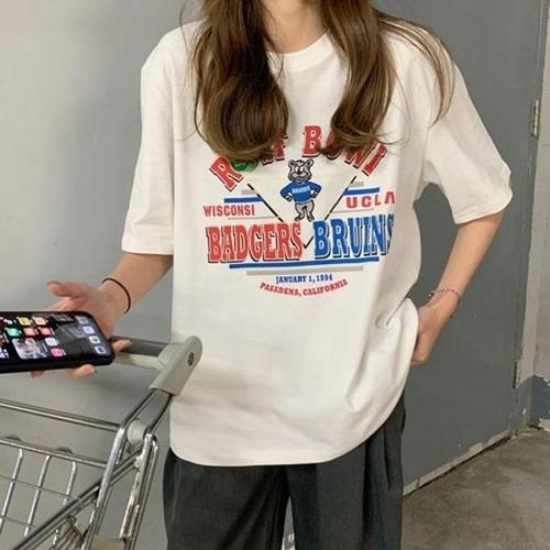 [라일리여성의류] Rly 캐릭터곰 캐주얼 로고프린트 루즈핏하프슬리브 상티
