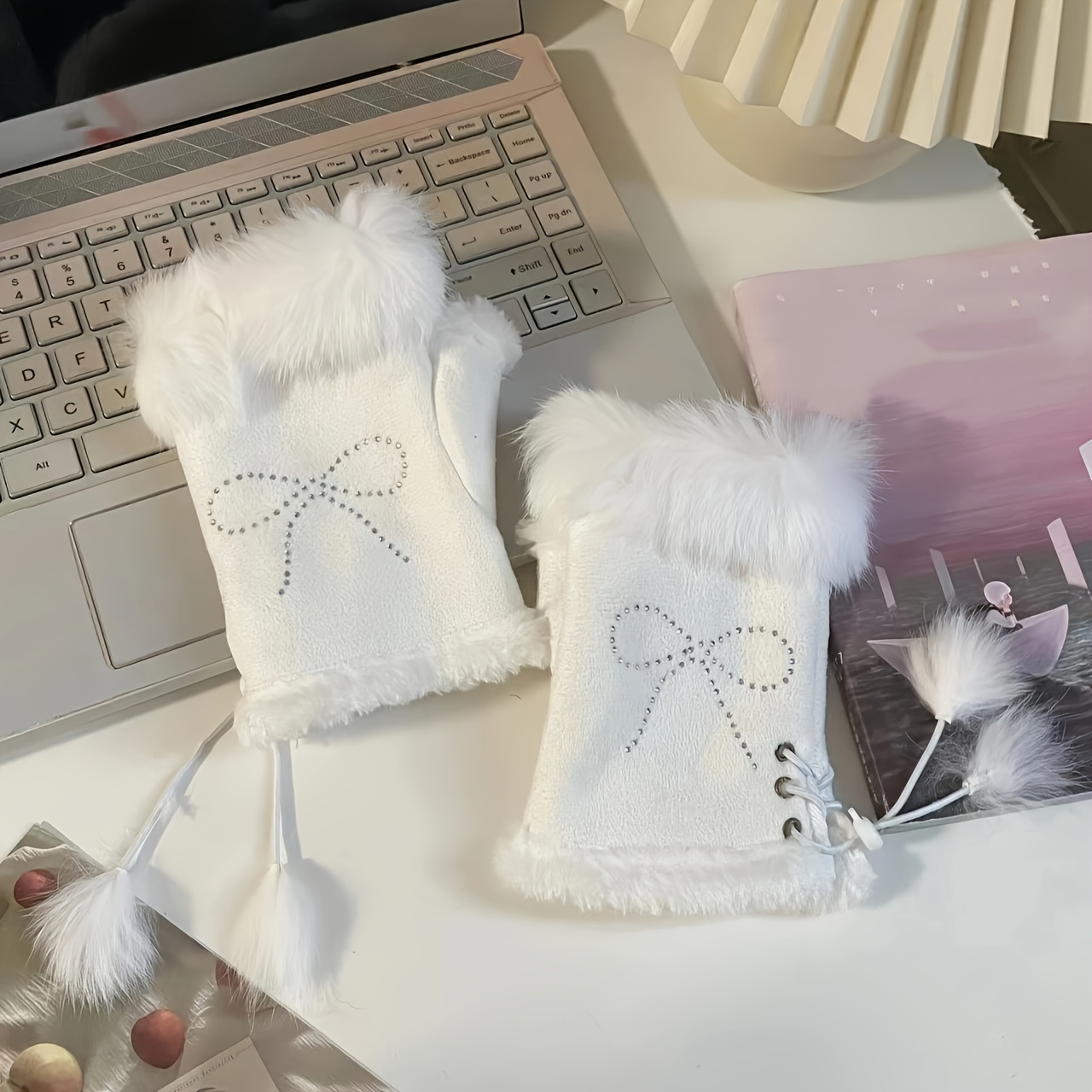 TEMU 여성용 우아한 플러시 반장갑, & 리본 장식 - 부드럽고 따뜻한 반장갑, 태슬 트림, 세탁기 사용 가능, 캐주얼 & 포멀 의상에 다용도, 겨울 장갑, 포멀 액세서리, 터치스크린 호환, 핑거리스 장갑, 겨울장갑 여성, 니트장갑, 여성장갑, 터치스크린 장갑, 겨울장갑