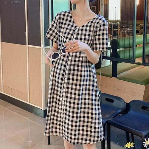 [셀럽하우스]여성 MHSF1775 귀여운 단추 체크 미디 원피스