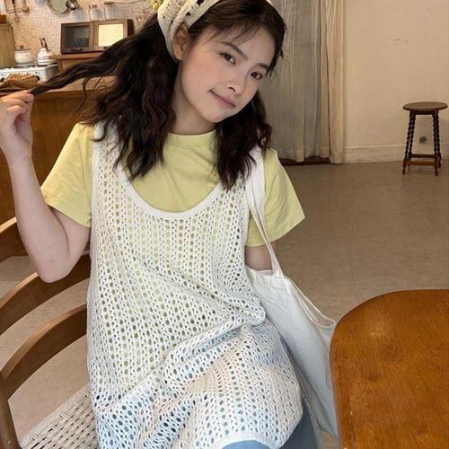 통기성이 깊은 그물 모양 짜임 디자인 여름에도 쾌적한 조끼 미디기장 멋스러운 포인트 패션