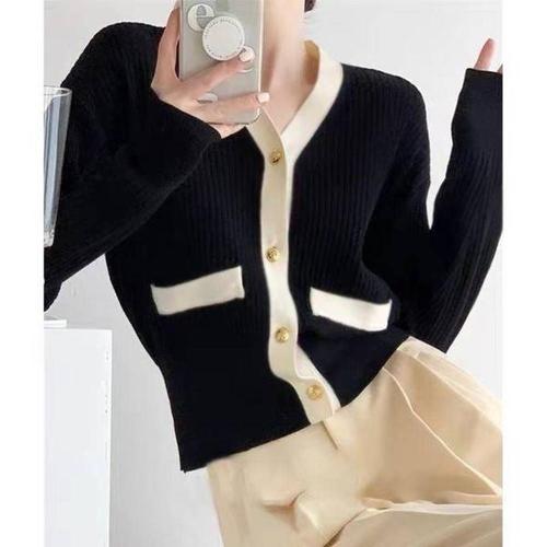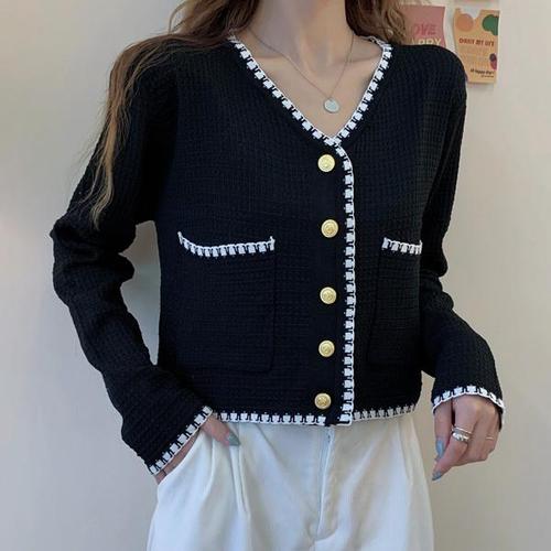 [에이치플러스몰]여성 2컬러 금장단추 클래식무드 배색 브이넥 가디건