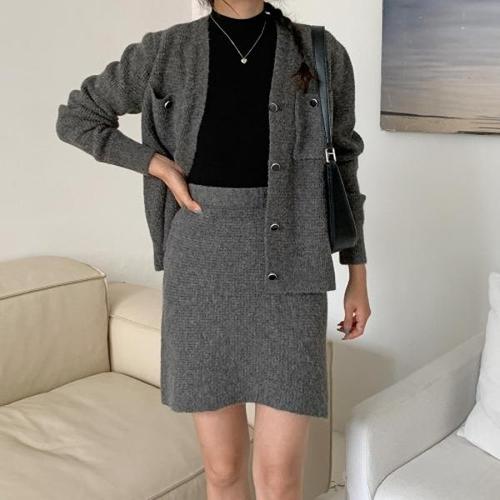 [다잇템][다잇템] 여자 FW 금장버튼 골지 치마 카디건 드레스업 세트_18606063_588872
