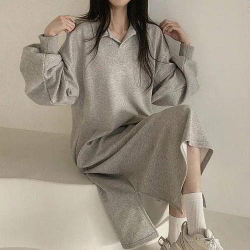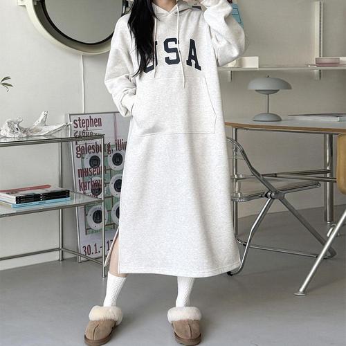 [문에이블]문에이블 여자 여성 겨울 루즈핏 후드넥 데일리 캐주얼 따뜻한 홈웨어 기모 긴팔 롱 원피스
