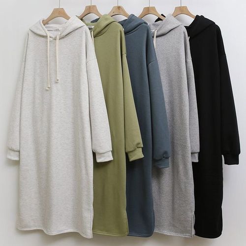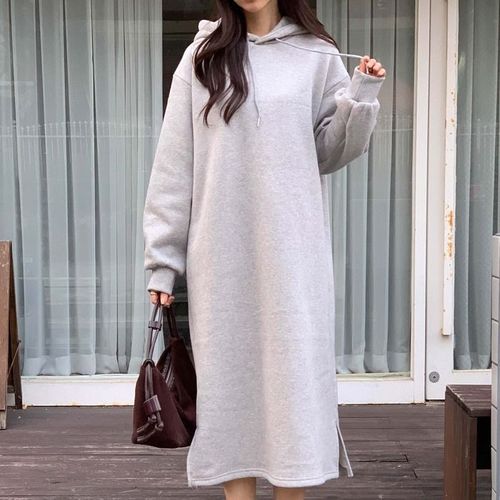 플러리싱 / 빅사이즈 기모 베이직 트임 롱 후드 원피스 플러리싱