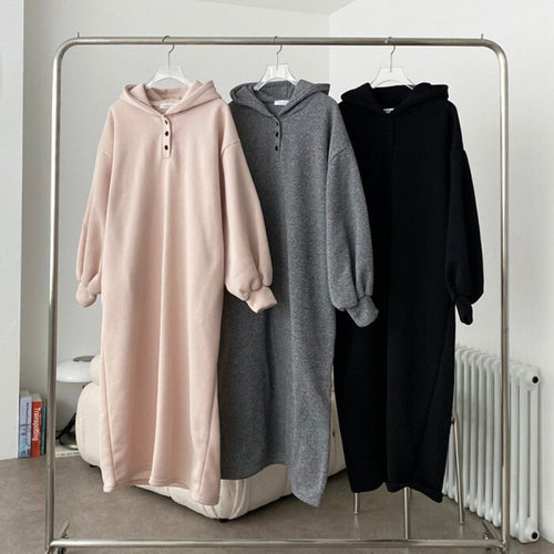 따숩 기모 단추 후드 맨투맨 롱 원피스