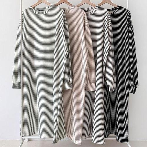 [옷자락] 여성 가을 라운드 퍼프 원피스 박시 단가라 긴기본