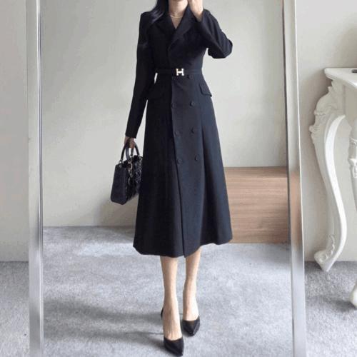 [엘린무드](벨트세트) 샤델 카라 더블버튼 롱 A라인 고급 벨트 단정한 기본 코트 원피스