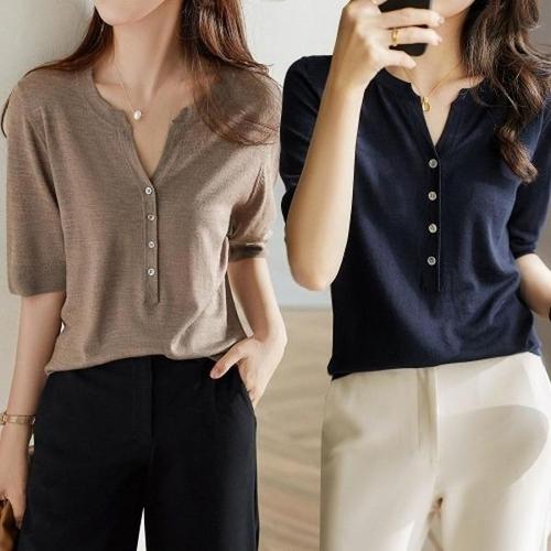 [엄지척]여성 여름 라운드 브이 넥 반팔 기본 니트 티_19682101_667501