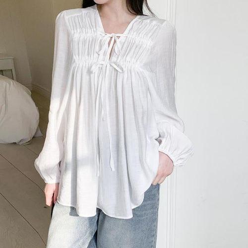 |CHH42B5|여성용 기본 브이넥 루즈핏 셔링 블라우스 데일리용