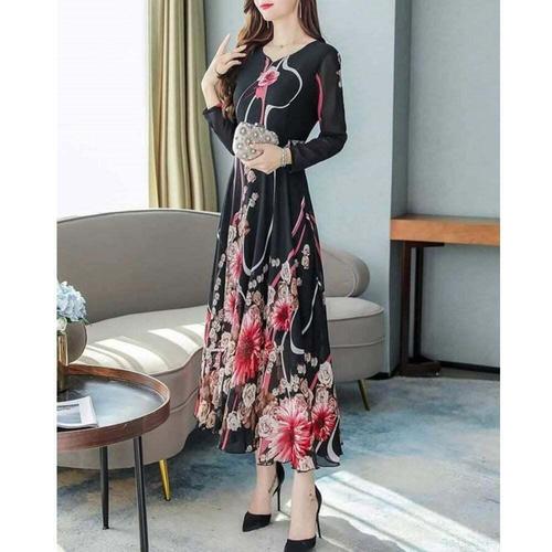 긴팔 롱 드레스 쉬폰 리본 프릴 여성 꽃무늬 원피스