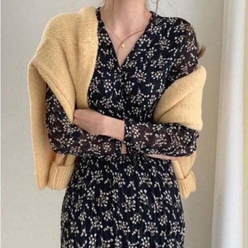 [셀럽하우스]여성 MRHK7860 봄원피스 꽃무늬 꽃잎 잔꽃 쉬폰 긴팔 롱 드레스