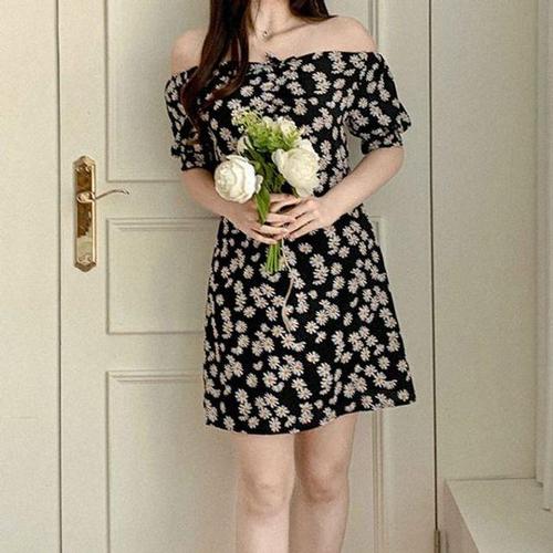 [셀럽하우스]꽃무늬 CKSP2240 반팔 원피스 브이넥 셔링 퍼프 미니 스커 GWM