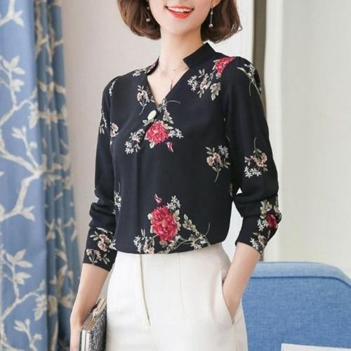 Vezri 중년 여성 봄 가을 플로럴 프린트 쉬폰 블라우스 긴팔 셔츠 하이넥