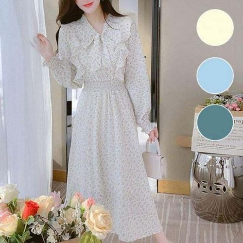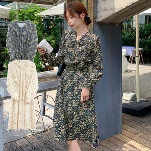 [셀럽하우스]긴팔 DWQB2928 꽃무늬 캐주얼 롱 드레스 필수템 밴딩 프릴 러플