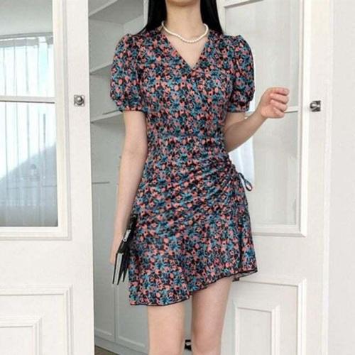 [셀럽하우스]꽃무늬 XUFD6973 반팔 데일리 브이넥 원피스 셔링 퍼프 미니 스