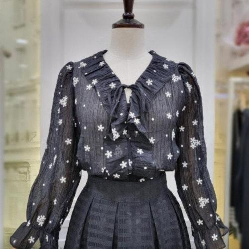 [신상오픈런]여성용 스팽글 꽃무늬 시스루 리본 자수 블라우스