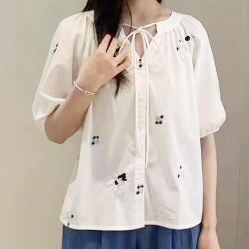 여성 리본 끈 꽃자수 반팔 블라우스 MSE-WBL-20759-아이보리
