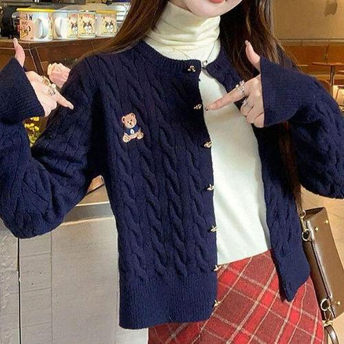 [셀러허브_여성트랜드패션]ONM 여성 라운드넥 곰돌이자수 꽈배기 긴팔 가디건
