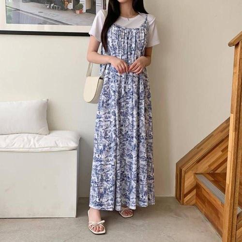 샵앤) 여성 바캉스룩 끈나시 핀턱 루즈핏 A라인 롱원피스 NTT-WDR-20750-스카이블루