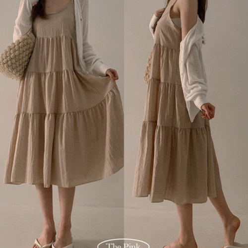 [1+1 2개] 여성 민소매 끈나시 플리츠 주름 원피스 롱 스커트