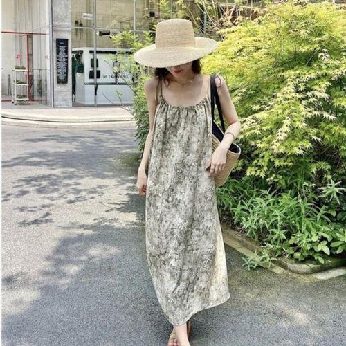 (신상 추천) 150kg까지 빅사이즈 1+1 여성 민소매 프렌치 입체 플리츠 끈나시 원피스 여름 편한 심플 스퀘어넥 등이드러난 우아한 모던 이너 매력 외출용 플레어 롱 원피스