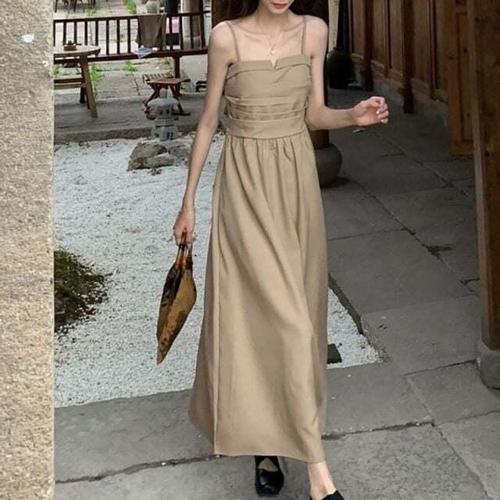 (신상 추천) 150kg까지 빅사이즈 1+1 여성 민소매 프렌치 입체 플리츠 끈나시 원피스 여름 편한 심플 스퀘어넥 등이드러난 우아한 모던 이너 매력 외출용 플레어 롱 원피스