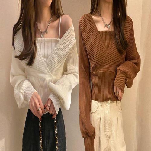 |CCT9656|여성 클래식 오프숄더 니트 긴팔 골지 어깨끈 스웨터