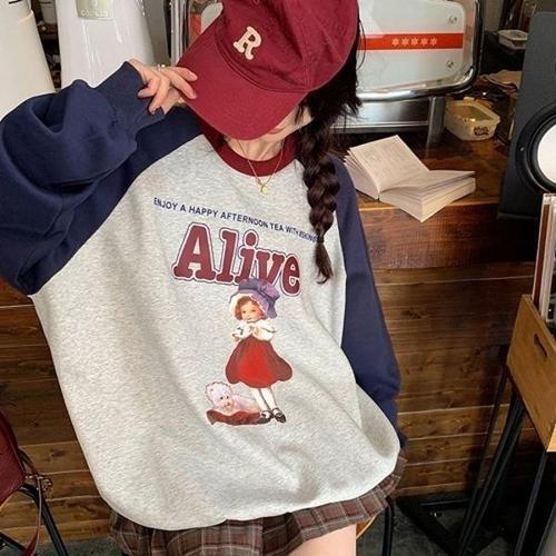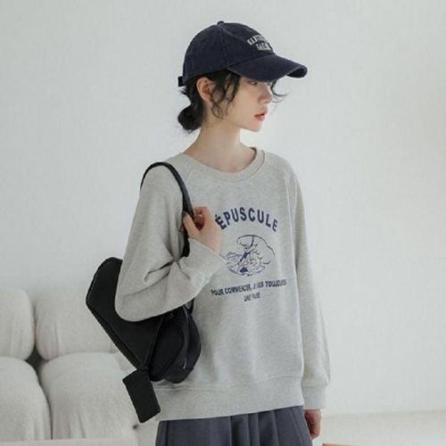 75kg까지 날씬해보이는 1+1 여성 빈티지 배색 레터링 나그랑 크롭 맨투맨 티셔츠 봄 가을 빅사이즈 오버핏 프린트 카운티 얇은 스포츠 학생복 루즈핏 심플 제인드 라운드 캐주얼 티