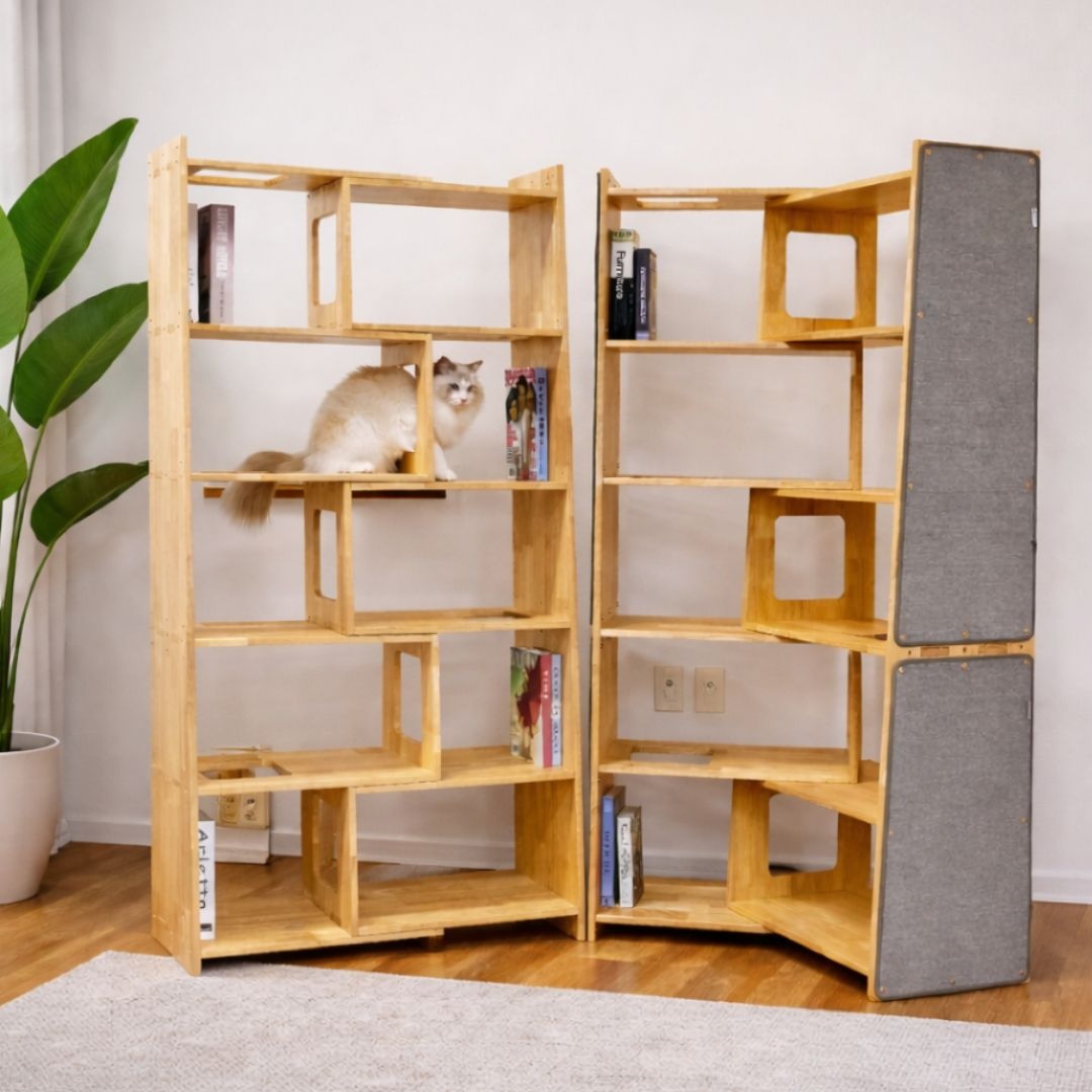 모던 가변형 책장타워 특대형 5단 계단형 캣타워 고무나무 원목
