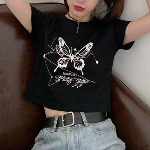 [에이치플러스몰]여자 나비프린팅 힙스러운 스타일 크롭 반팔티셔츠